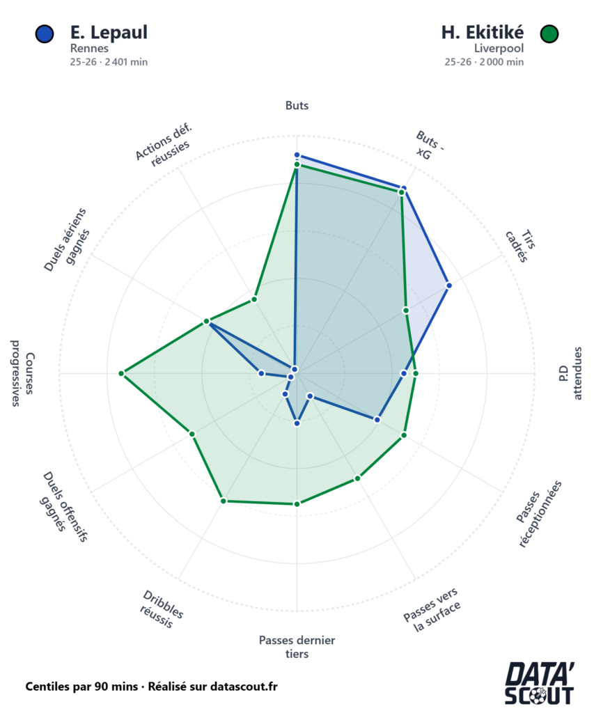 Il serait cependant malhonnête de présenter Lepaul comme un clone d’Ekitiké. Le radar Data’Scout (centiles par 90 minutes, saison 2025-2026) révèle des écarts de profil significatifs. Si Lepaul se défend bien sur les buts et les tirs cadrés, il est largement distancé sur les courses progressives, les duels offensifs, les passes vers la surface et les passes dans le dernier tiers.