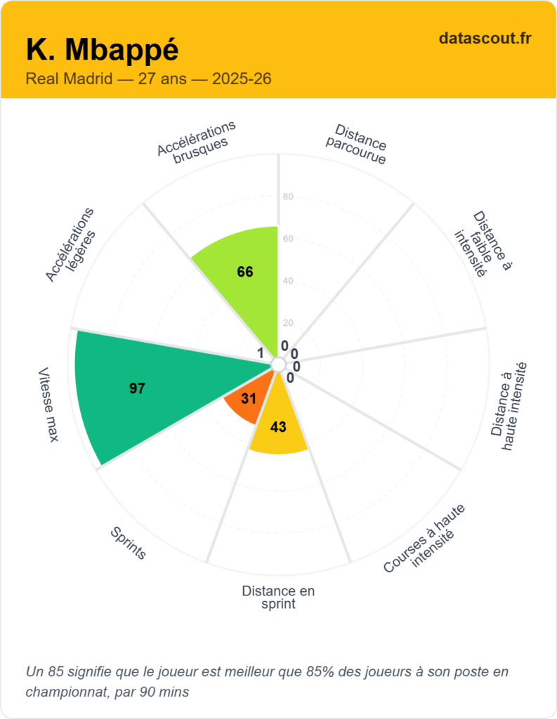 Sur le plan physique, Mbappé reste une anomalie. Sa vitesse maximale (97) le place toujours parmi les joueurs les plus rapides du monde. Ses accélérations restent un cauchemar pour les défenses.