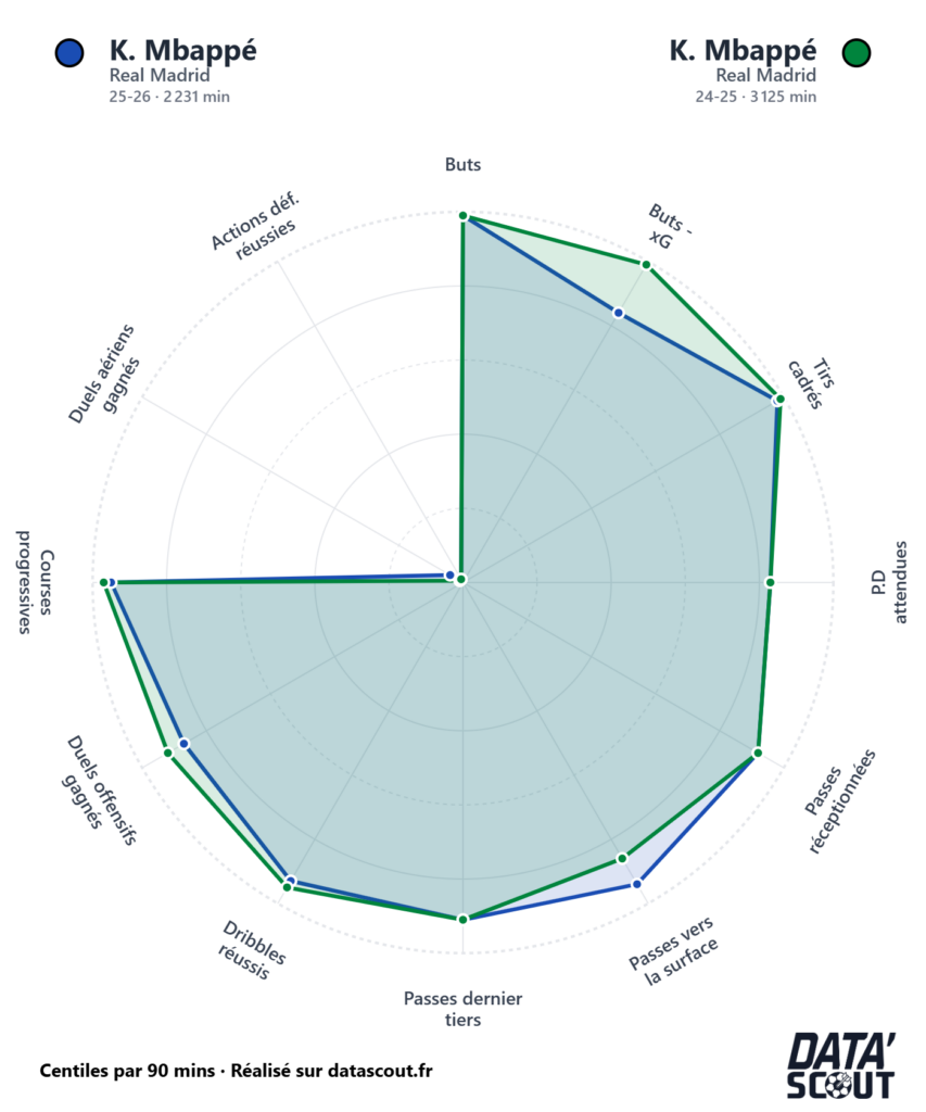 Comparé à sa saison précédente, sa première au Réal, Mbappé progresse légèrement dans plusieurs secteurs. Légèrement plus impliqué dans le jeu, plus propre techniquement, il conserve son efficacité devant le but.