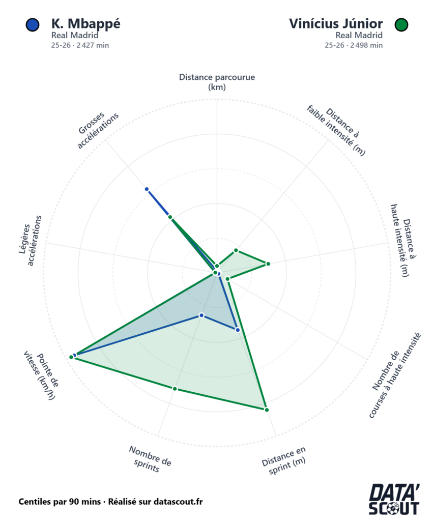 Le comparatif Data’Scout est implacable. Sur les critères physiques, Mbappé et Vinicius affichent des profils quasi identiques : pointe de vitesse similaire, grosses accélérations dans la même zone, nombre de sprints comparables. Vinicius devance légèrement sur la distance en sprint et le nombre de courses à haute intensité — mais l’écart est minimal.