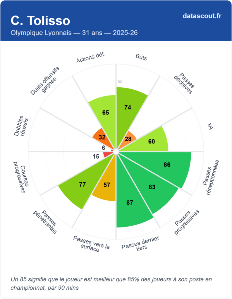 Ses points forts sont réels : passes réceptionnées au 86e percentile, passes dernier tiers au 87e percentile, passes progressives au 83e percentile. Tolisso reste un bon distributeur, capable de faire jouer son équipe vers l’avant. Il marque aussi — 7 buts en 25 matchs cette saison — avec besoin de peu de tirs pour être efficace.