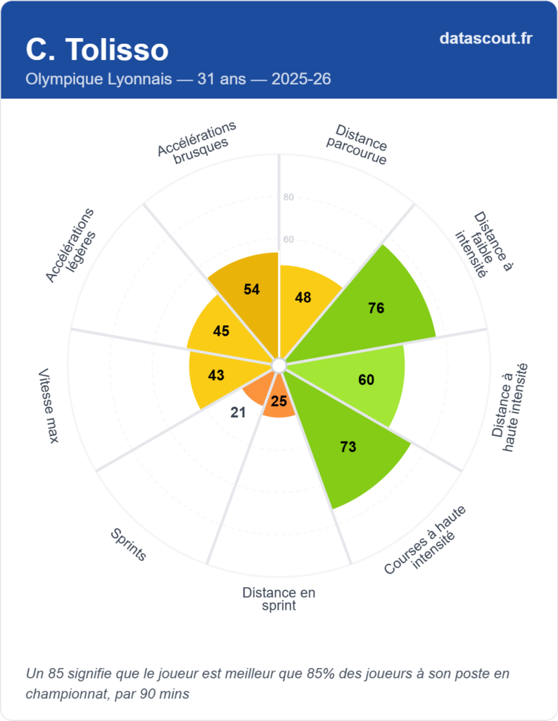 Mais ses faiblesses sont tout aussi évidentes. Il rate beaucoup de dribbles, tacle peu, et ne fait pas progresser le ballon par la course. Son profil physique est particulièrement préoccupant : vitesse max au 21e percentile, sprints au 25e percentile, accélérations légères au 43e percentile. À 31 ans, Tolisso n’est plus le milieu dynamique et percutant qu’il était à la Coupe du monde 2018.