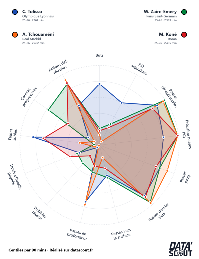 Le radar comparatif entre les quatre joueurs est édifiant. Sur presque tous les critères — passes réceptionnées, passes progressives, passes dernier tiers, courses progressives — Zaïre-Emery, Tchouaméni, Koné et Rabiot surclassent Tolisso. Le seul domaine où le Lyonnais se maintient à niveau, c’est la création dans le dernier tiers. Mais ce n’est pas suffisant pour justifier une présence régulière dans un milieu de terrain qui a rarement été aussi bien doté.