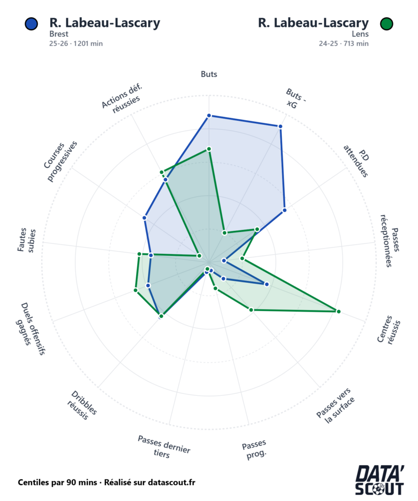 La comparaison entre sa saison à Brest et sa courte saison à Lens en 2024-2025 (713 minutes) est instructive. À Brest cette saison (1 201 minutes), Labeau-Lascary a nettement progressé sur les buts, les buts moins xG et les actions défensives réussies. Son profil s’est recentré sur la finition pure, avec des valeurs en nette hausse par rapport à sa saison précédente.