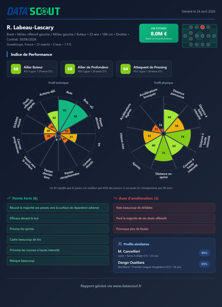 Le rapport Data’Scout du 24 avril 2026 est encourageant. Labeau-Lascary affiche un indice de 68 comme ailier buteur et ailier de profondeur, se classant respectivement 23e et 24e en Ligue 1. Des classements honorables pour un joueur qui revenait d’une rupture des ligaments croisés.