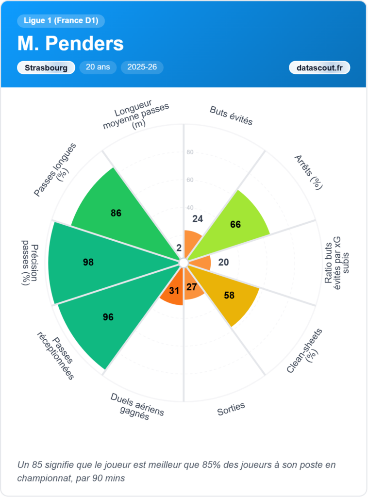 Penders, lui, c’est l’inverse. Le Belge de Strasbourg est une machine à toucher des ballons — précision de passes courtes à 98, passes réceptionnées à 96 — et remporte la majorité de ses duels aériens. Mais le Strasbourg Racing est dans une situation sportive compliquée, et ça se voit : le jeune gardien de 20 ans subit beaucoup de buts même quand les tirs adverses sont peu nombreux. Son score de clean-sheets (58) et ses arrêts (66) restent insuffisants pour un club qui lutte. Avec 19 millions d’euros de valeur marchande estimée et un contrat jusqu’en 2026, son avenir s’écrira certainement ailleurs.