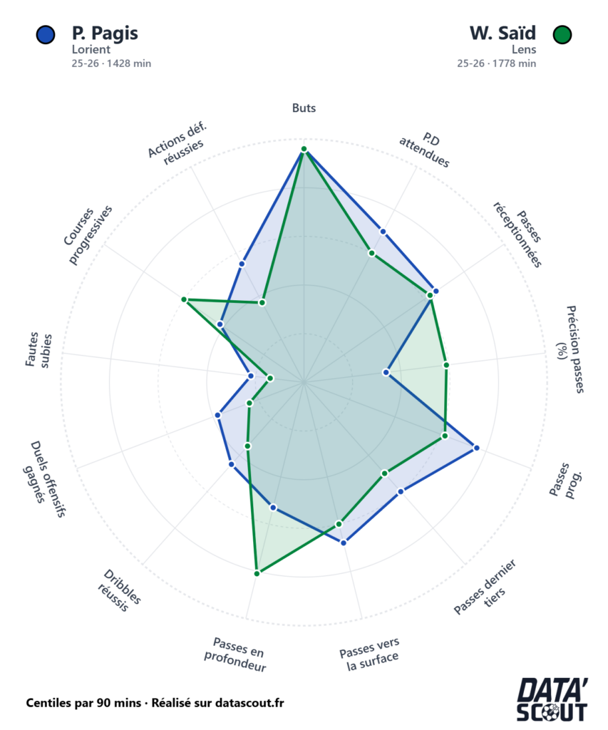Le radar comparatif le confirme visuellement : les deux joueurs se superposent sur les buts, les passes décisives attendues et la présence dans le dernier tiers. Saïd domine sur les dribbles réussis et les courses progressives — logique pour un joueur de 30 ans au sommet de sa maturité physique. Pagis, lui, sort devant sur la précision des passes et les passes progressives, signe d’un profil plus technicien et combinateur.