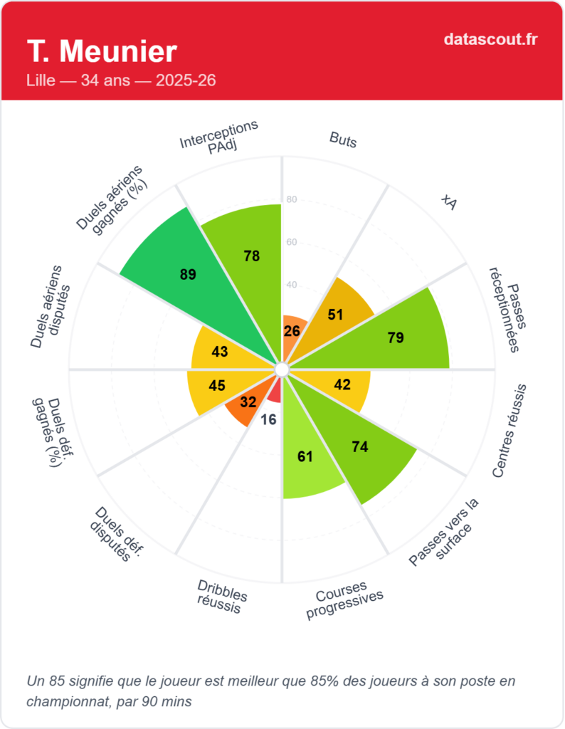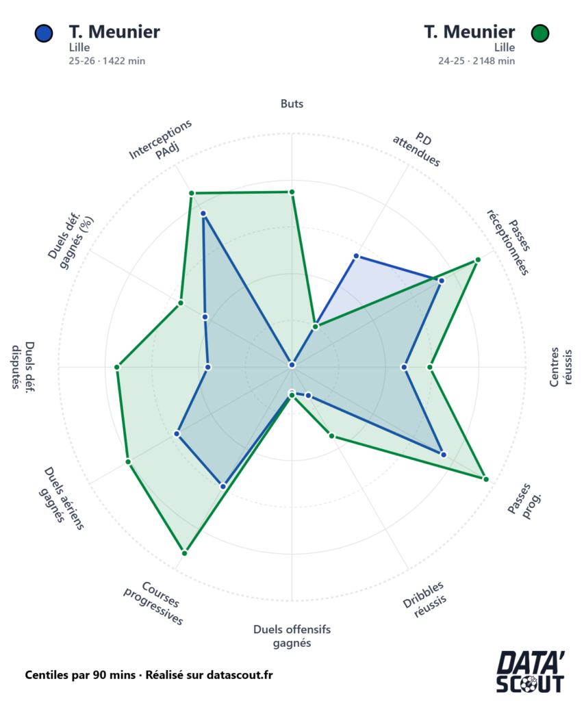 Sur le terrain, Thomas Meunier reste un joueur fiable. Avec Lille, il a disputé 18 matchs pour 1 passe décisive. Mais les chiffres bruts ne racontent pas tout.