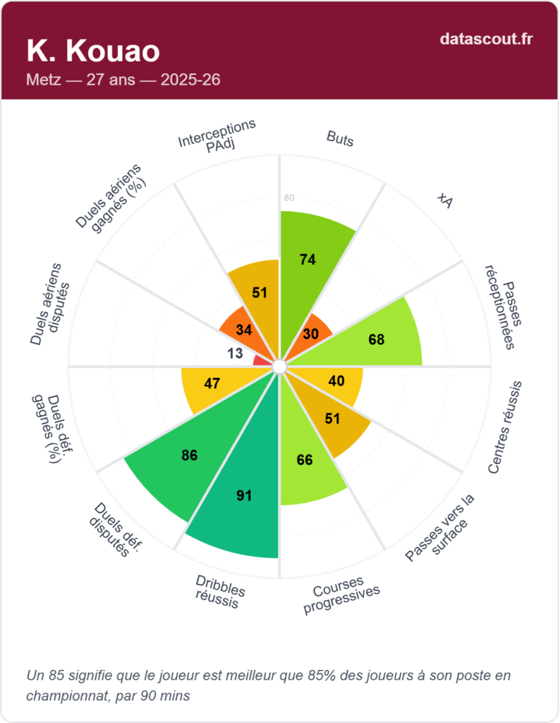 Les chiffres de Kouao cette saison sont frappants pour un joueur évoluant dans la pire équipe de Ligue 1. Son indice de performance atteint 80 comme latéral offensif, ce qui le place 17e de Ligue 1 à ce poste. Pas mal pour un joueur de lanterne rouge. En tant que latéral intérieur : 79e centile, 15e de L1. Défenseur moderne : 76e centile, 26e de L1.