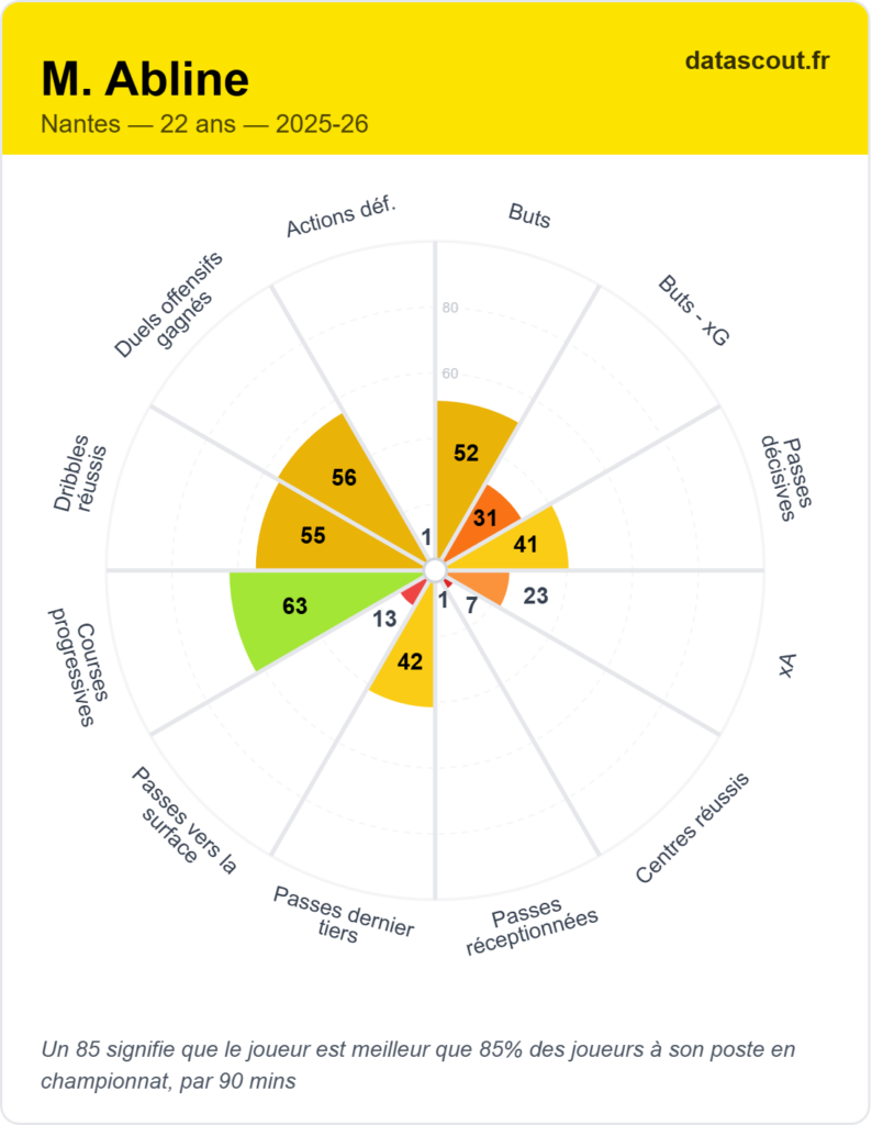 Lecture data : Nantes s’appuie sur une base stable, avec peu de turnover chez les cadres. Problème : à l’image d’un Abline qui reste à 4 buts inscrits en Ligue 1, les cadres ne portent pas l’équipe.