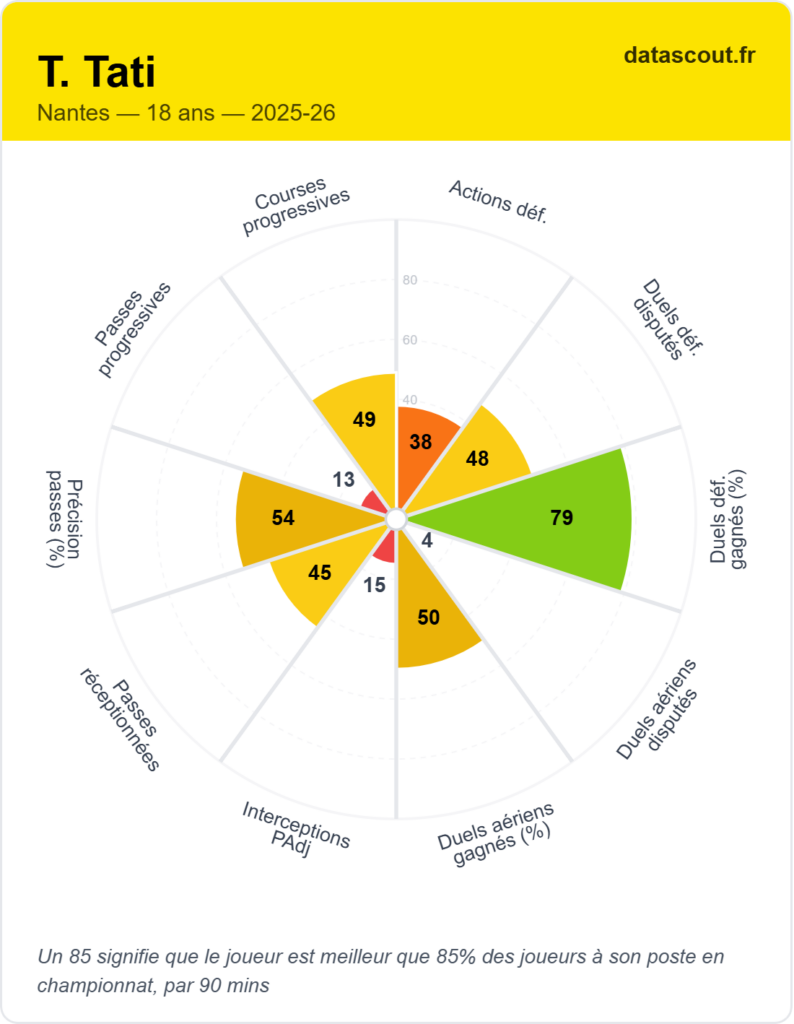 Ce qui saute immédiatement aux yeux, c’est son profil physique. Malgré son jeune âge, Tati affiche des standards impressionnants. Ses données sont parlantes : 99 en accélérations légères, 94 en courses à haute intensité, 91 en distance parcourue.