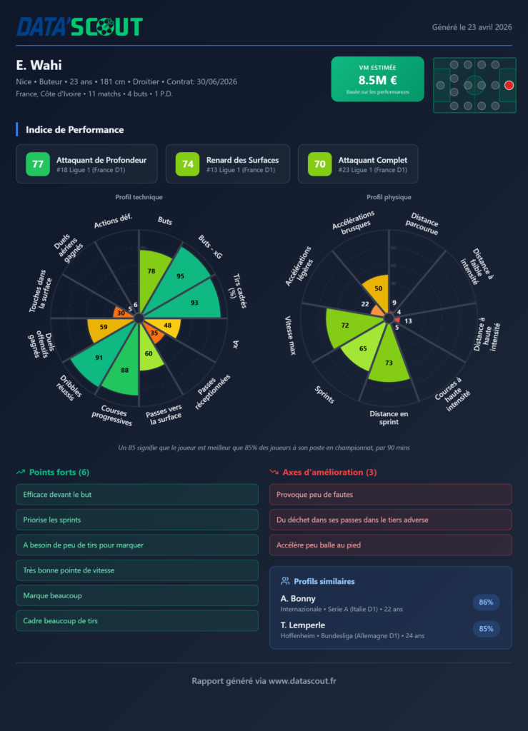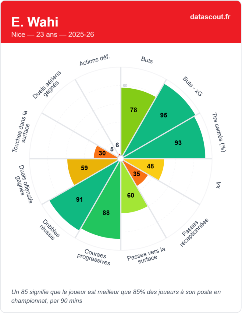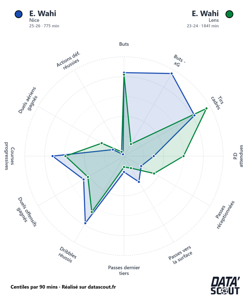 La comparaison entre sa saison actuelle à Nice et sa grande saison à Lens en 2023-2024 est instructive. En 1 841 minutes sous le maillot lensois cette année-là, Wahi avait affiché des valeurs solides sur les passes décisives attendues et les passes vers la surface. À Nice, avec seulement 775 minutes de jeu depuis son arrivée, son radar se concentre davantage sur l’axe de la finition pure, avec des valeurs élevées sur les buts, les buts moins xG et les tirs cadrés. Un profil plus resserré, mais redoutablement efficace dans son registre.