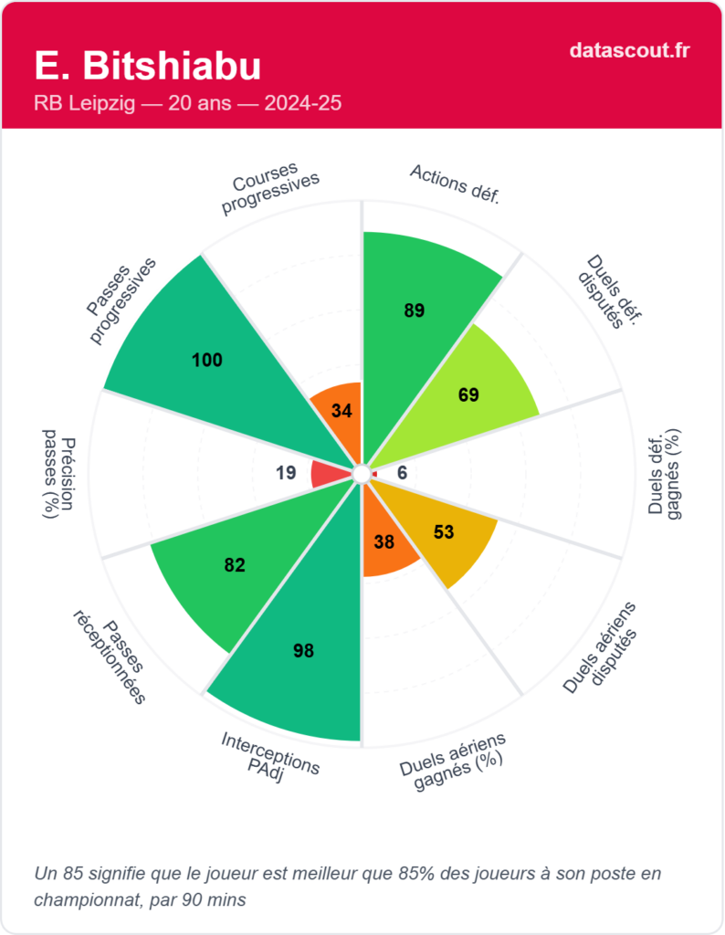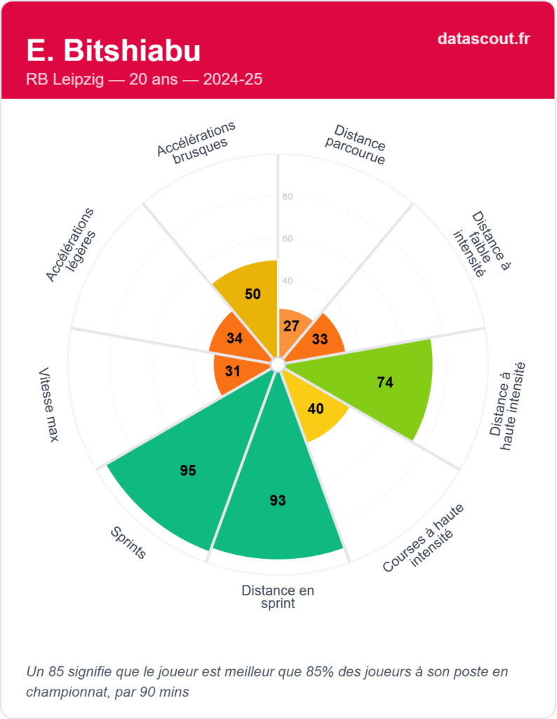 Les statistiques issues de DataScout sont claires : Bitshiabu est un monstre physique. Ses chiffres sur les sprints (95) et la distance parcourue en sprint (93) le placent largement au-dessus de la moyenne à son poste. Il enchaîne les efforts à haute intensité (74), un atout majeur dans le football moderne.