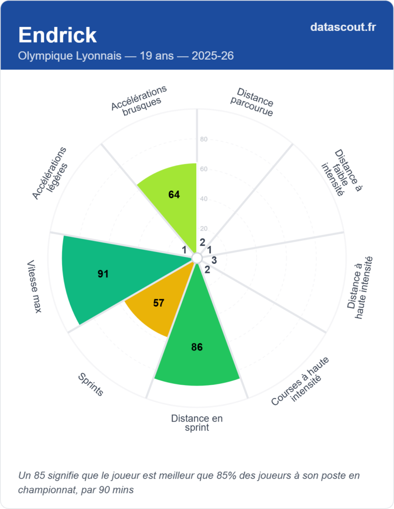 Son radar technique est éloquent. Tirs cadrés au 90e percentile, xA au 93e percentile, passes vers la surface au 95e percentile, passes réceptionnées au 91e percentile, courses progressives au 96e percentile, dribbles réussis au 97e percentile, duels offensifs gagnés au 89e percentile. Autrement dit : Endrick crée énormément, se déplace parfaitement, remporte ses duels et cadre ses tirs à un niveau élite.