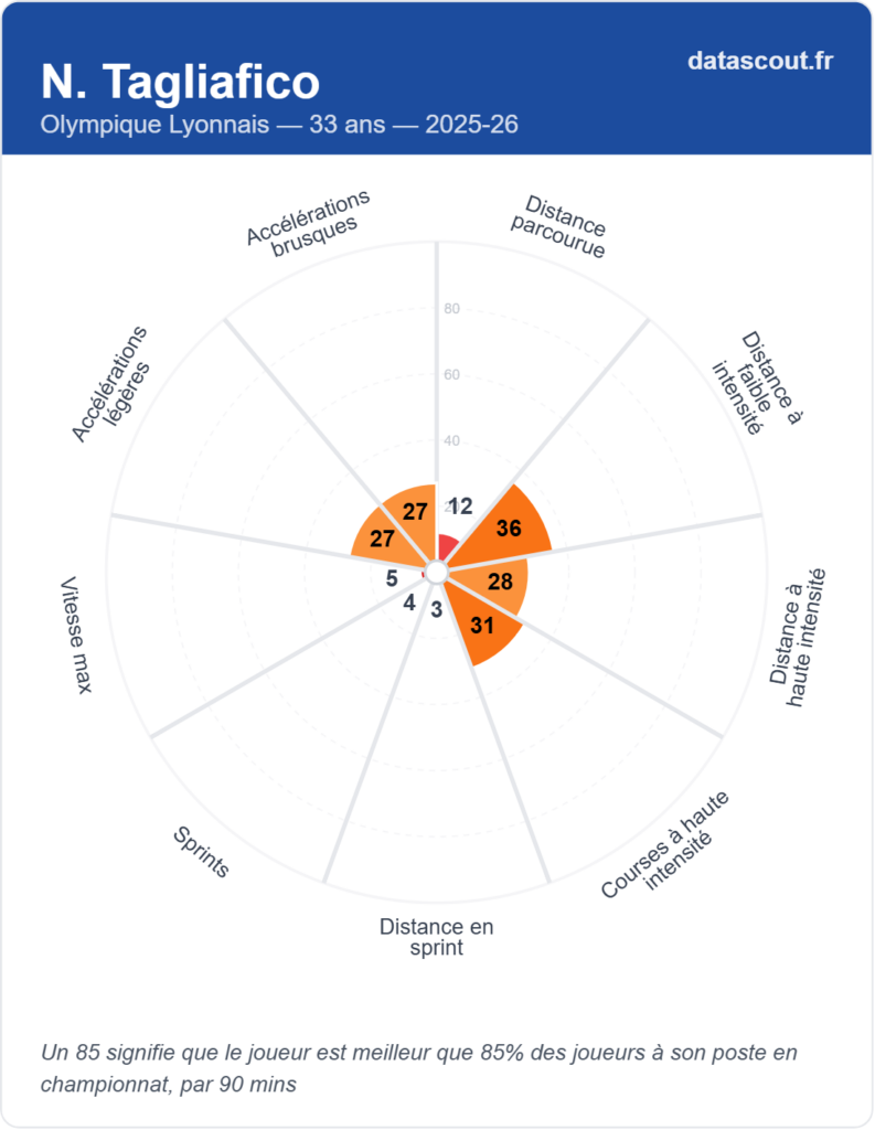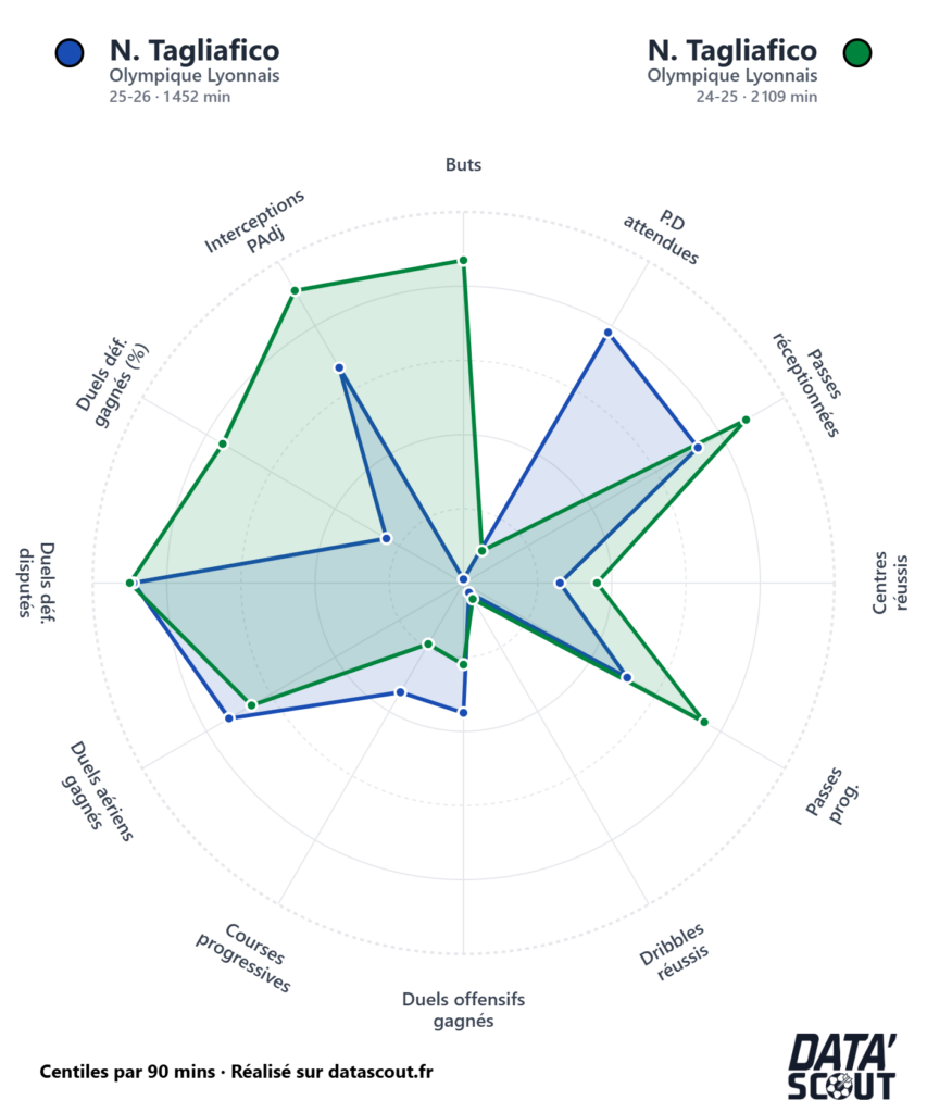 Les données sont parlantes. Si Tagliafico reste solide dans les duels et l’activité défensive, plusieurs signaux interrogent :
