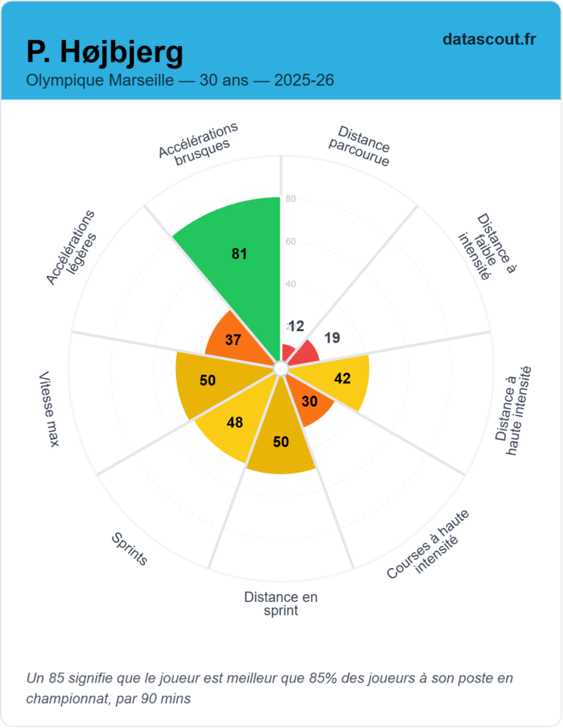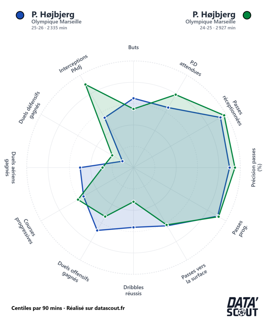 Moins d’interceptions, moins de projection vers l’avant, un impact offensif limité. Højbjerg reste constant, mais il ne surperforme plus.