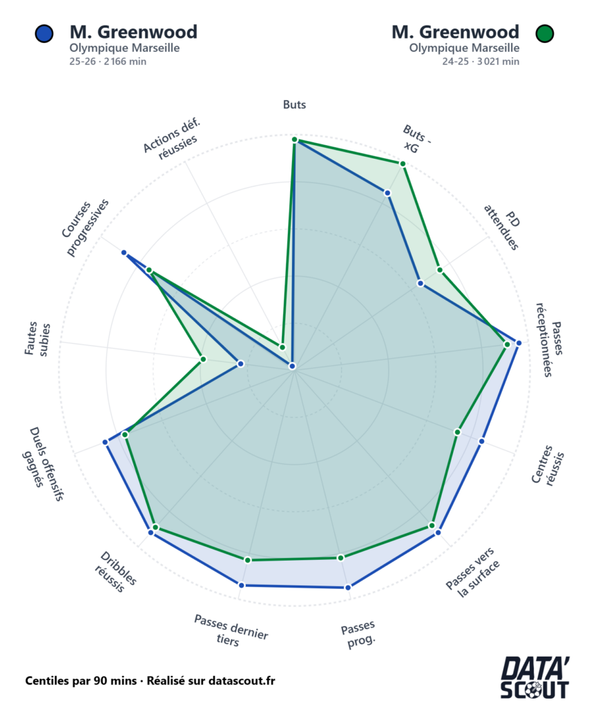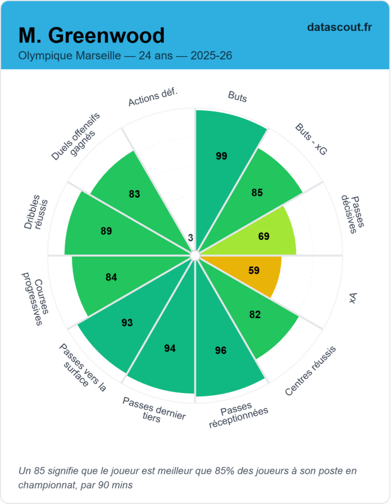 Les données issues de DataScout confirment cette domination. Greenwood affiche des scores très élevés dans quasiment tous les domaines offensifs :