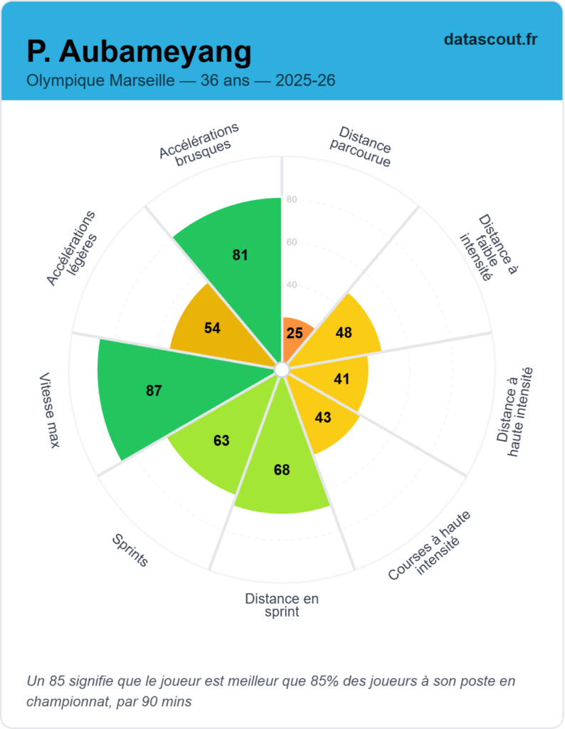 L’information à retenir : Alors qu’il fêtera ses 37 ans en juin, Aubameyang reste le joueur le plus rapide de l’OM avec 36,2 km/h lors des tests internes.