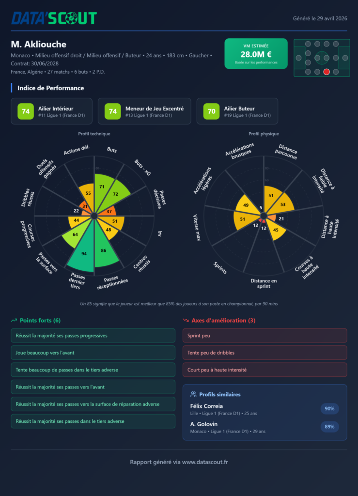 Data’Scout positionne Akliouche comme ailier intérieur et meneur de jeu excentré, avec un score de 74 dans les deux catégories — 11e et 13e en Ligue 1. Valeur marchande estimée à 28 millions d’euros, contrat jusqu’en 2028. À 24 ans, il affiche 6 buts et 2 passes décisives en 27 matchs cette saison.