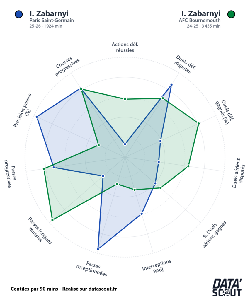 Si la régression défensive est claire, le jeu avec ballon, lui, a évolué. Au PSG, Zabarnyi affiche une précision de passe très élevée et participe activement à la construction.