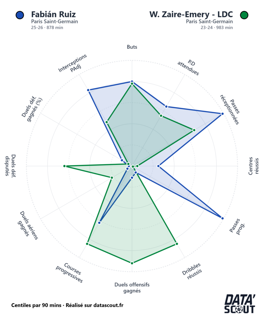Le radar datascout comparant les deux joueurs illustre parfaitement la situation. Sur les passes progressives et les passes réceptionnées, les deux profils sont proches. Ruiz garde un léger avantage sur les interceptions et les duels défensifs gagnés. Mais sur les courses progressives, les dribbles réussis, les duels offensifs et les passes en profondeur, Zaïre-Emery écrase littéralement la comparaison. Le vert dépasse le bleu sur la moitié inférieure du radar, là où se joue l’impact physique et dynamique dans le jeu moderne.