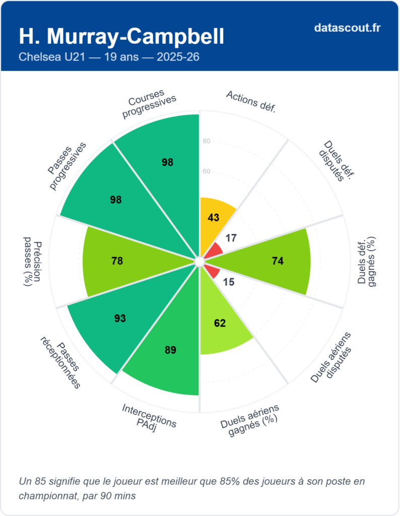 À seulement 19 ans, le défenseur central anglais affiche déjà des données très solides. Les chiffres DataScout parlent pour lui :