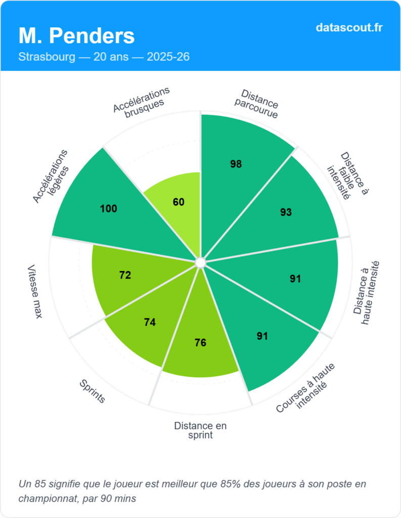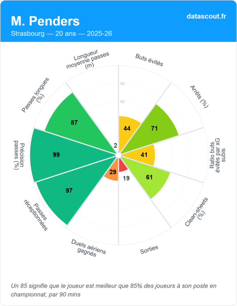 La courbe d’évolution de la performance de Penders dit tout. En 2022-23 et 2023-24 à Genk II, son indice de gardien moderne stagnait à 28. Presque rien. Deux saisons à ce niveau et rien de notable. Puis le saut à Strasbourg en Ligue 1. Et là, la courbe décolle de façon spectaculaire pour atteindre 74 cette saison. Une progression de 46 points en un an. C’est exceptionnel pour un gardien de 20 ans.