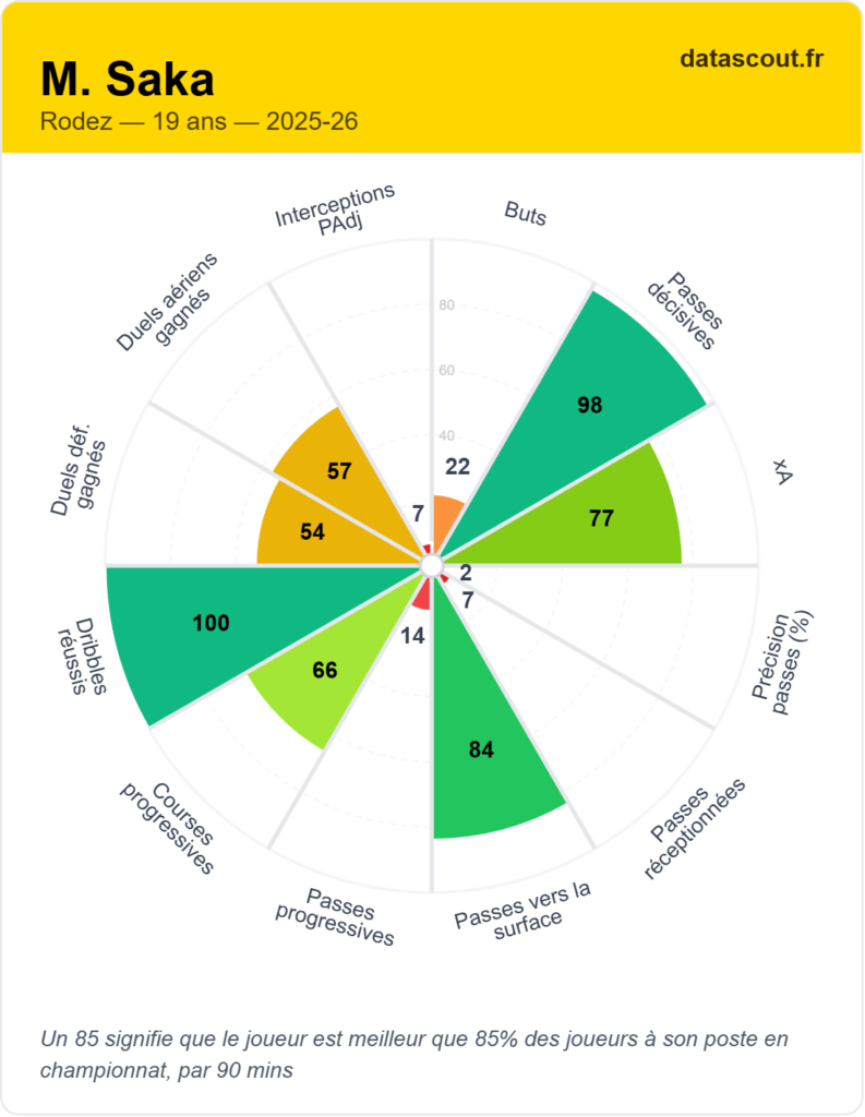 Prêté par Toulouse à Rodez, Mathis Saka s’impose comme l’une des révélations de la saison en Ligue 2. À seulement 19 ans, le milieu affiche déjà des statistiques et un impact qui attirent l’attention.