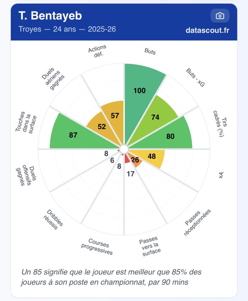 Si Troyes monte en Ligue 1 cet été, comme les probabilités le laissent penser, la vraie question sera de savoir si Bentayeb monte avec le club ou si son profil de finisseur d’élite en Ligue 2 attire d’autres acheteurs. À 24 ans, sous contrat, avec les meilleures statistiques offensives du championnat : il mérite en tout cas l’attention.