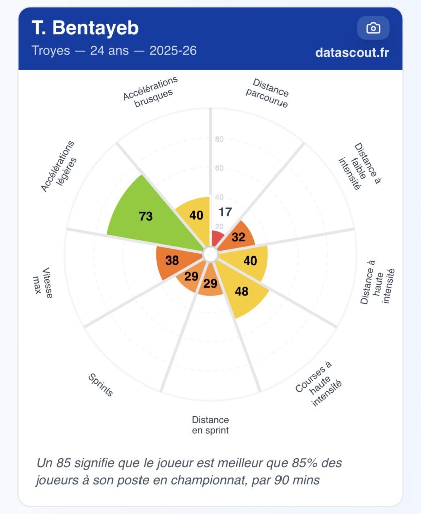 Dans le système de Stéphane Dumont, Bentayeb est l’élément différenciant. Troyes est leader de Ligue 2, et son attaquant en est l’une des clés offensives majeures. Ses stats de contribution dans le dernier tiers — buts et création d’occasions — sont celles qui permettent à l’ESTAC de tenir tête à Saint-Étienne et Le Mans sur la durée.