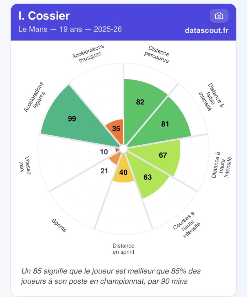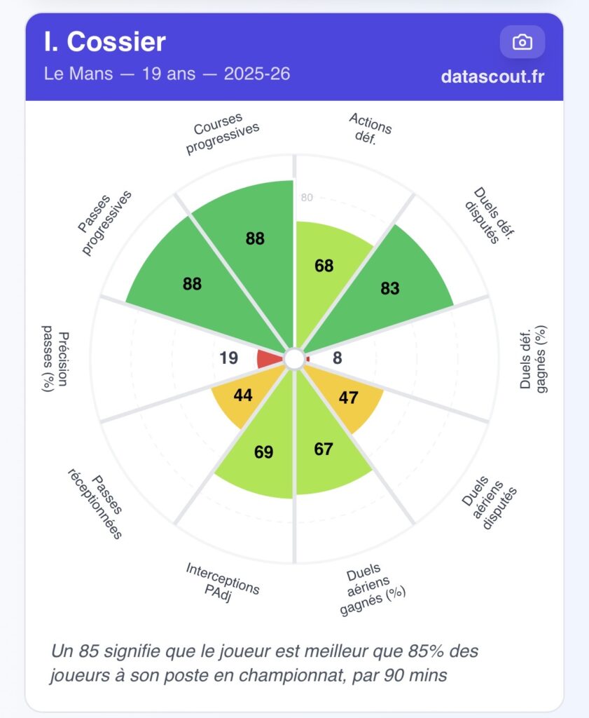 Mais tout n’est pas parfait. Cossier doit encore progresser dans les duels défensifs. Certaines données montrent qu’il peut encore gagner en constance dans l’impact pur. Son jeu long reste aussi perfectible.