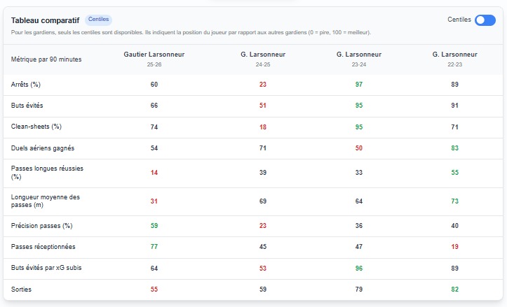 L’erreur face à Troyes, qui a rapidement tourné en boucle sur les réseaux, n’est pas un accident isolé. Elle s’inscrit dans une tendance que les chiffres confirment : Larsonneur n’est plus le gardien tranchant et souverain qu’il était. Son point faible reste le jeu long — passes longues réussies au percentile 14 cette saison, longueur moyenne des passes à 31 — mais ce n’est pas ce qui préoccupe en priorité. C’est bien sa capacité à stopper les tirs et à limiter les buts par rapport aux xG subis qui pose question.