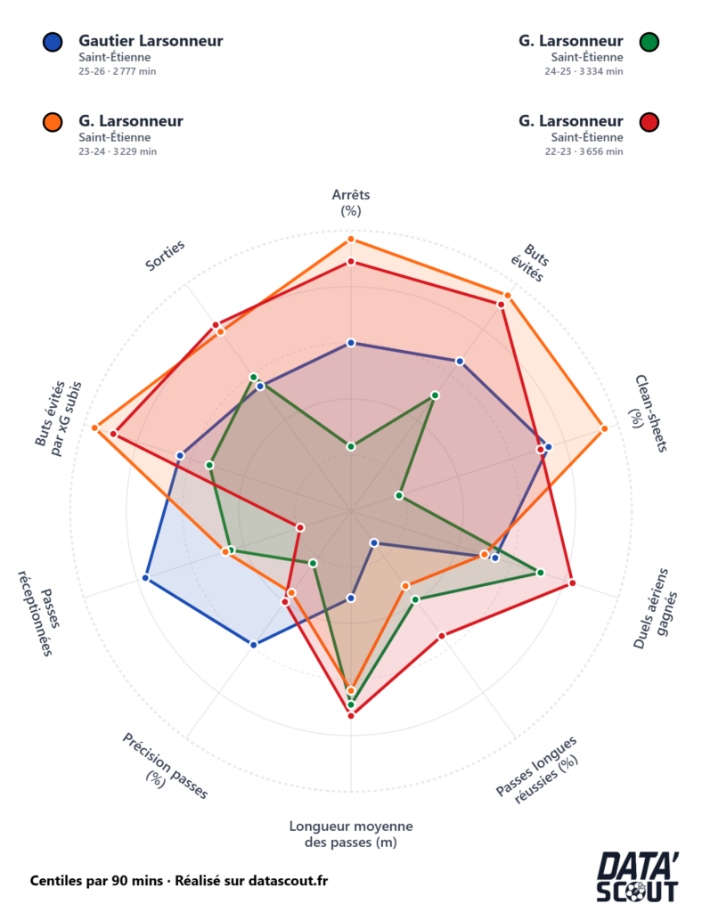 Il fut un temps où Larsonneur faisait partie des meilleurs gardiens de Ligue 2. En 2022-2023, ses chiffres étaient éloquents : arrêts au percentile 97, buts évités à 95, clean-sheets à 95, buts évités par xG subis à 96. Un gardien au sommet de son art dans l’antichambre du football français, décisif dans la montée historique de Saint-Étienne. Le genre de portier qui fait gagner des points à son équipe.