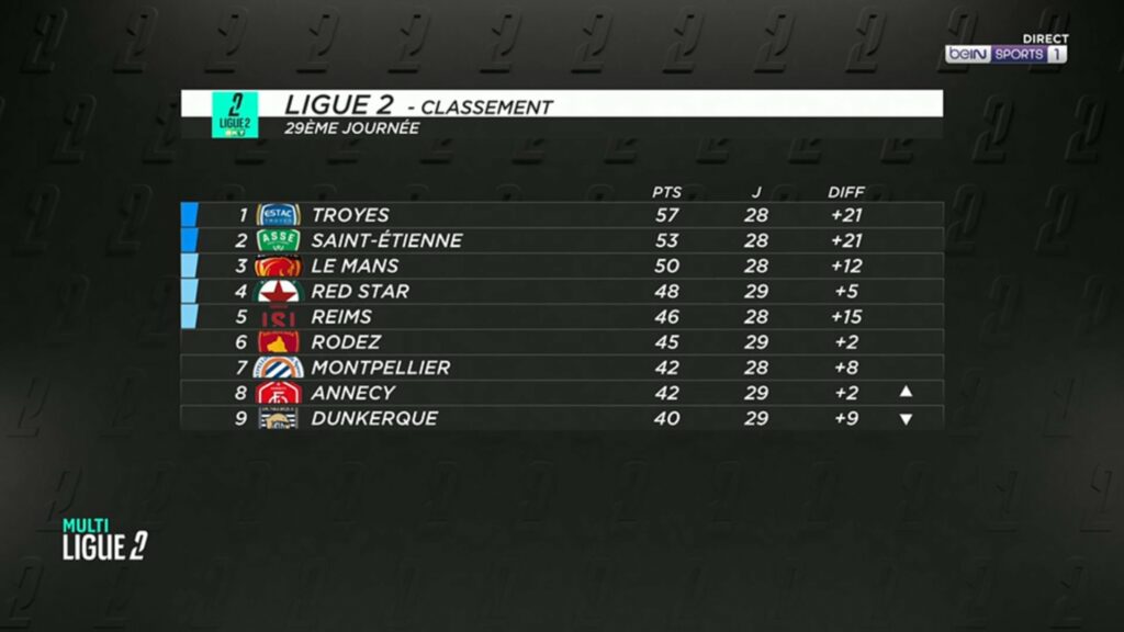 Quatre matchs restent à venir. Reims – Boulogne et Montpellier – Troyes samedi 14h. Nancy – ASSE en prime Time à 20h. Et enfin Le Mans qui recevra Pau en clôture de cette J29 de Ligue 2 lundi.