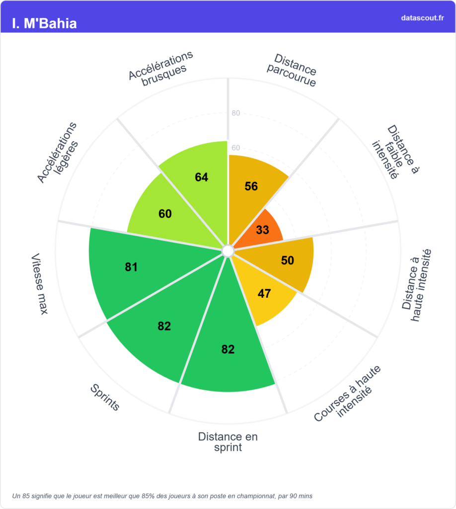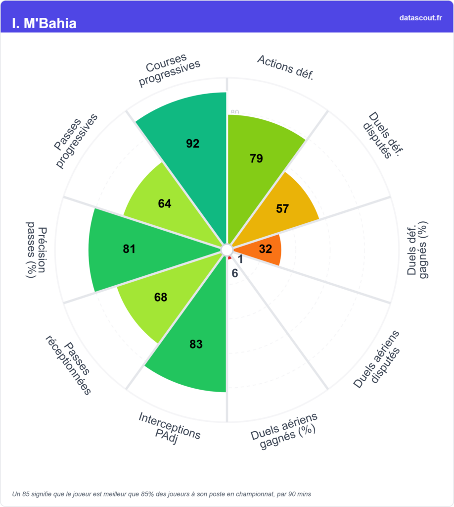 Dans le détail, M’Bahia coche de nombreuses cases recherchées aujourd’hui. Rapide, explosif sur les premiers appuis, il excelle dans la gestion de la profondeur. Sa vitesse de pointe et son volume de course en font un défenseur capable de rattraper des situations compromises. Un atout précieux pour les équipes qui jouent avec un bloc haut.