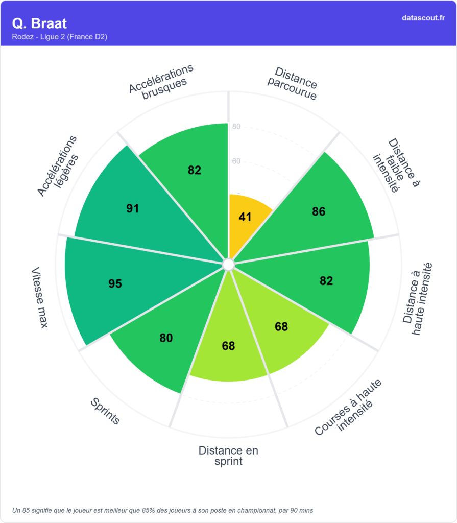 Les chiffres de Quentin Braat sont tout simplement impressionnants. Dans les buts évités, il affiche un indice de 95. Un niveau élite. Cela signifie concrètement qu’il sauve régulièrement son équipe au-delà des attentes. Son pourcentage d’arrêts (91) confirme cette tendance. Braat ne se contente pas d’être solide, il est décisif.