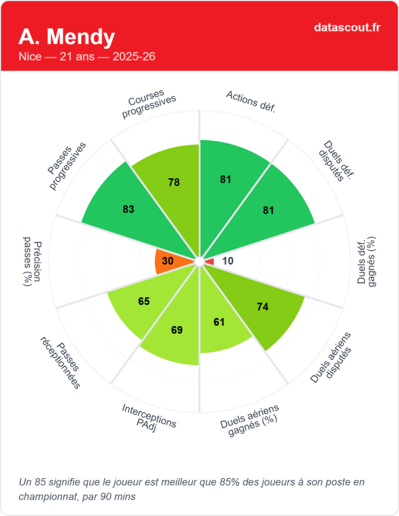 Né à Marseille et international sénégalais, Antoine Mendy possède un profil intéressant pour un club en reconstruction. Défenseur central de formation, il peut également évoluer au poste de latéral droit, ce qui en fait un joueur polyvalent et apprécié des recruteurs. Sous contrat avec Nice jusqu’en juin 2028, sa valeur marchande est estimée autour de 4 millions d’euros. À 21 ans, il fait partie de cette génération de jeunes défenseurs capables d’apporter de la vitesse, de la projection et une relance propre. Les données de performance montrent notamment plusieurs qualités :