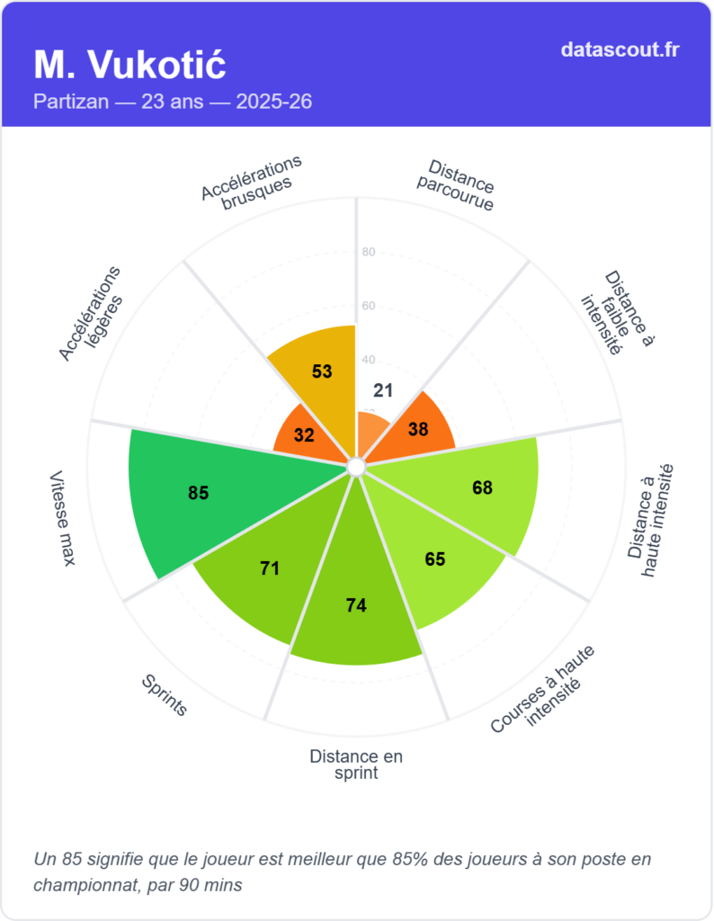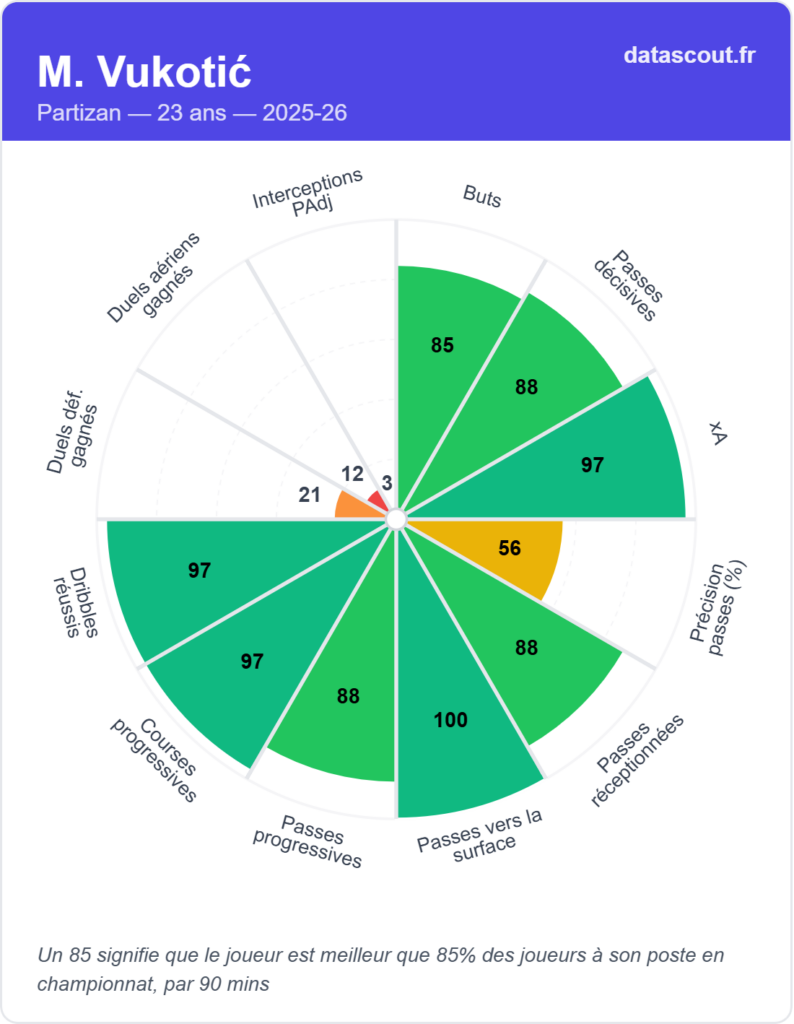 Le radar technique de Vukotić pour la saison 2025-26 est difficile à ignorer. Passes vers la surface : 100e percentile. Dribbles réussis : 97e percentile. xA (passes décisives attendues) : 97e percentile. Courses progressives : 97e percentile. Passes progressives : 88e percentile. Passes décisives : 88e percentile. Buts : 85e percentile. Vitesse maximale : 85e percentile.